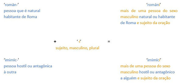Percebemos que a flexão dos substantivos “romanos” e “inimigos” é que dita se essas palavras são sujeito ou objeto da oração. Quando aparecem com o morfema ‘-os’, como em romānos e inimīcos, tanto “romanos” quanto “inimigos” são objeto direto; por outro lado, quando flexionados com ‘-i’, como em Romāni e Inimīci, esses substantivos assumem a função de sujeito da sua oração.